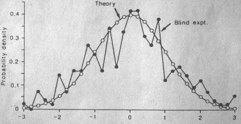 On peut constater ici un accord quasi parfait entre les expériences et la théorie d’une répartition en gaussienne. En d’autres termes, les variations par rapport à la moyenne relèvent d’une répartition normale, d’une répartition réellement au hasard. Et de telles expériences sont, à juste titre, qualifiées par tout scientifique de « saines ».