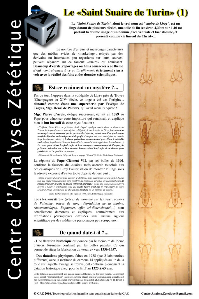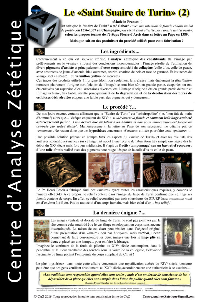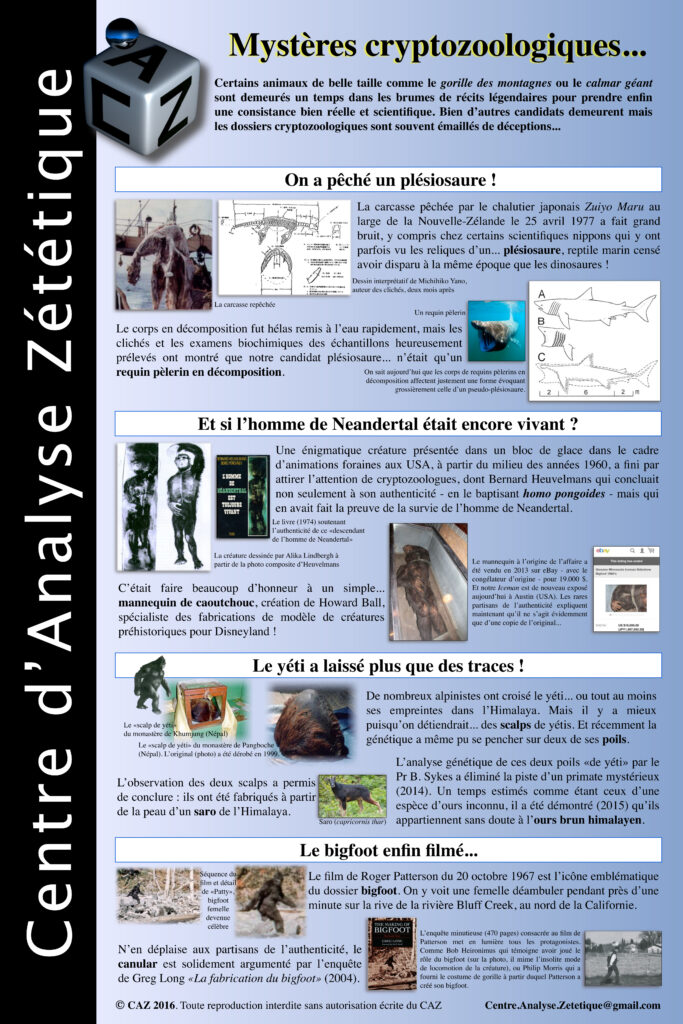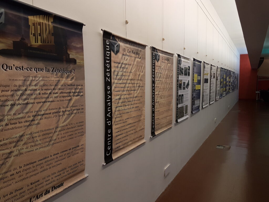 Pour les organismes qui le souhaitent, le Centre d’Analyse Zététique propose l’organisation d’expositions et de conférences sur les thèmes de la zététique et de l’esprit critique. L’exposition se compose de nombreux panneaux format A0 traitant chacun d’un thème et de quelques objets pouvant être exposés tels que des illusions d’optique ou des dispositifs liés à des expériences menées par le CAZ. Quelques exemples de panneaux sont proposés ci-dessous ainsi qu’une liste non exhaustive des thèmes abordés.