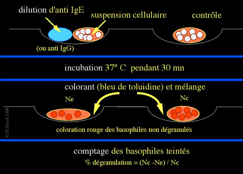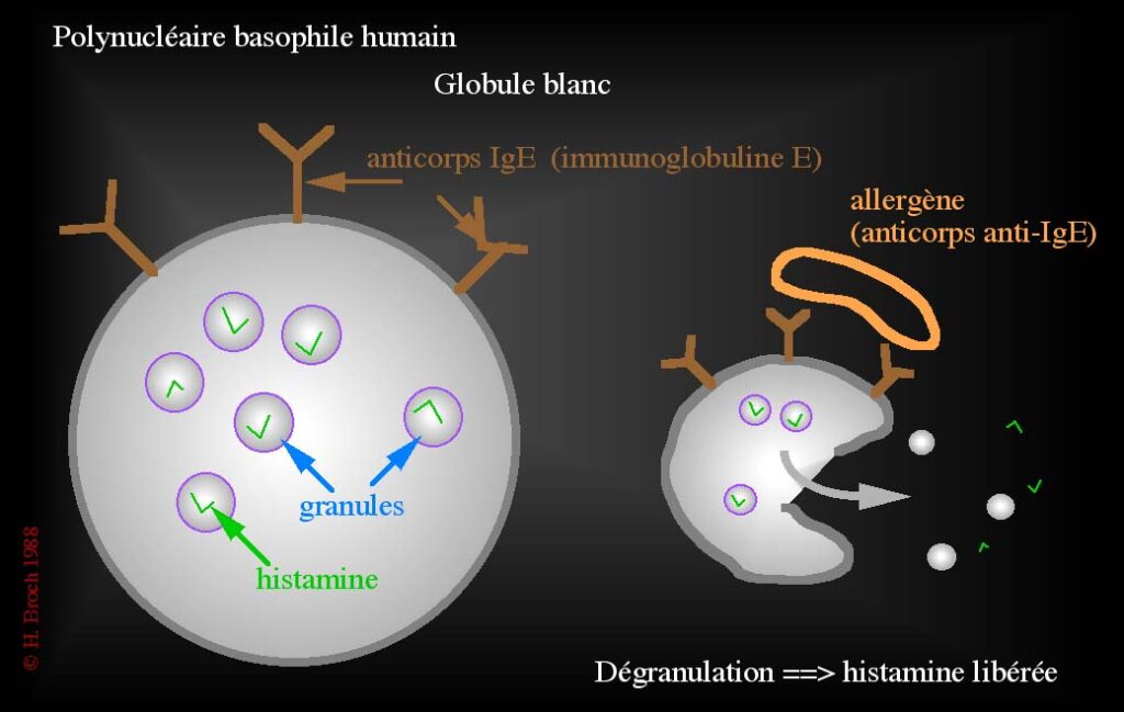 – Quand des polynucléaires basophiles humains – globules blancs qui renferment des granules contenant de l’histamine et possèdent sur leur surface des anticorps du type immunoglobuline E (IgE) – sont exposés à des anticorps anti-IgE, ils perdent leurs granules: on dit qu’ils « dégranulent ».